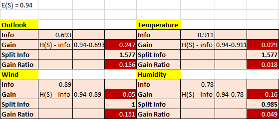 Once we calculate for remaining variables below will the Gain Ratio for all variables.