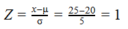 As per the Z table P(x<25) is 0.841345 or 84.1345%.(P(Z=1) = 0.3413 we need to include the area of left side also so P(Z<1)=0.3413+0.5)